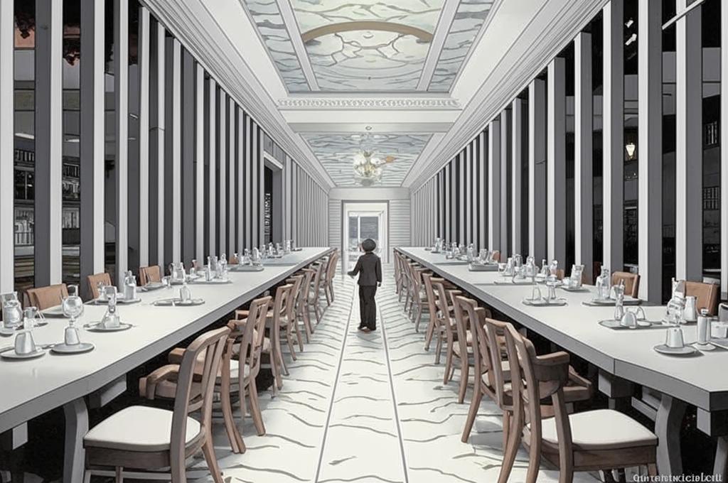 - Ресторан: представляется пустым, что подчеркивает ощущение потерянности.