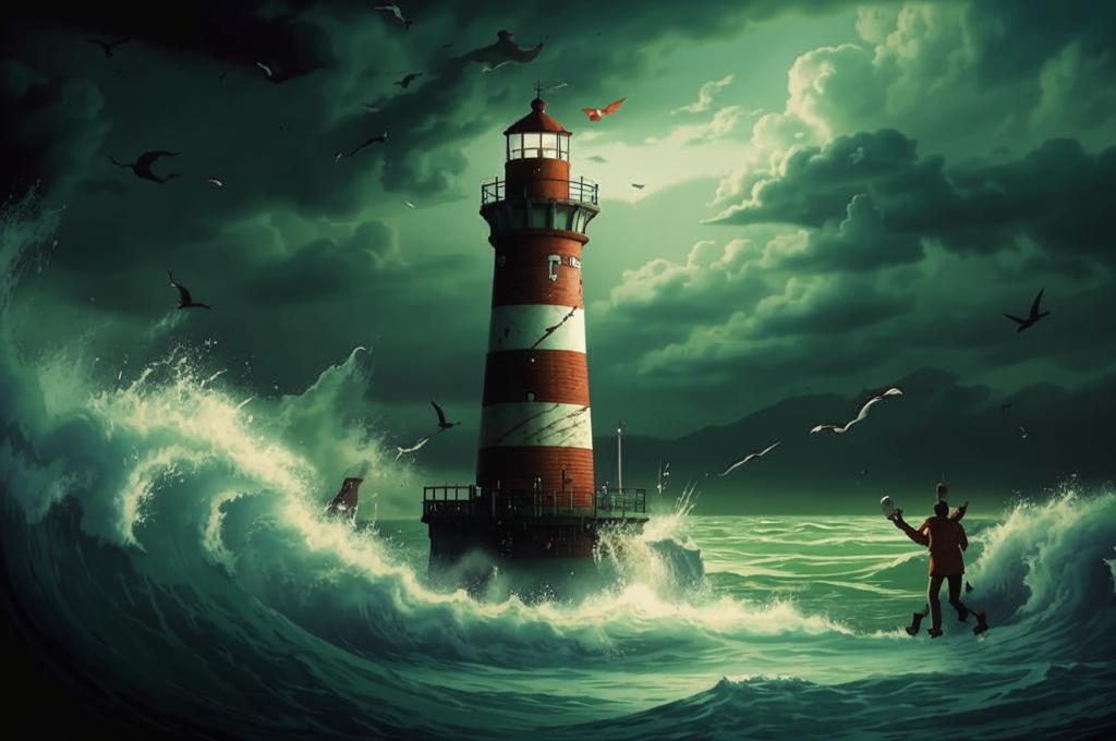 Морская обстановка создает мрачно-тревожное чувство, подчеркиваемое образами смерти. Но внезапное возникновение маяка вносит ноту надежды в это описание.
