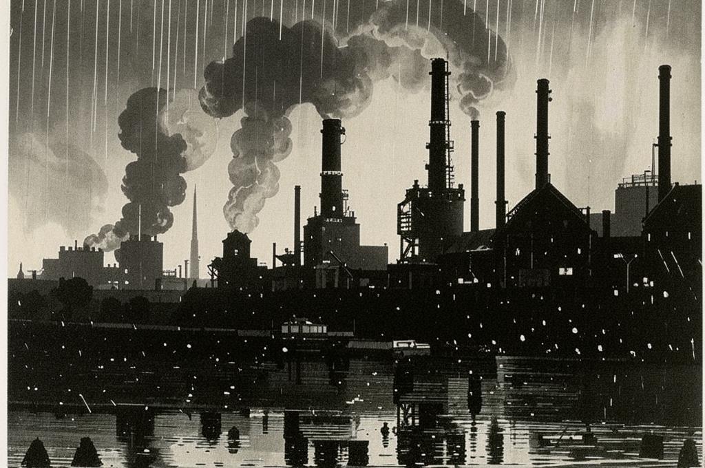 - Дым фабричных труб: олицетворяет индустриализацию, которая влияет на восприятие города.