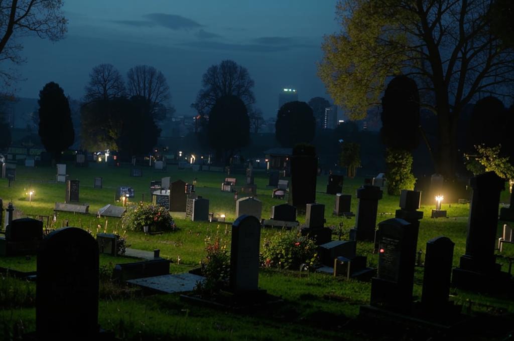 Кладбище представлено как тихое и мирное место, которое одновременно вызывает страх и восхищение. Оно наполнено предметами и образами, связанными со смертью и памятью.