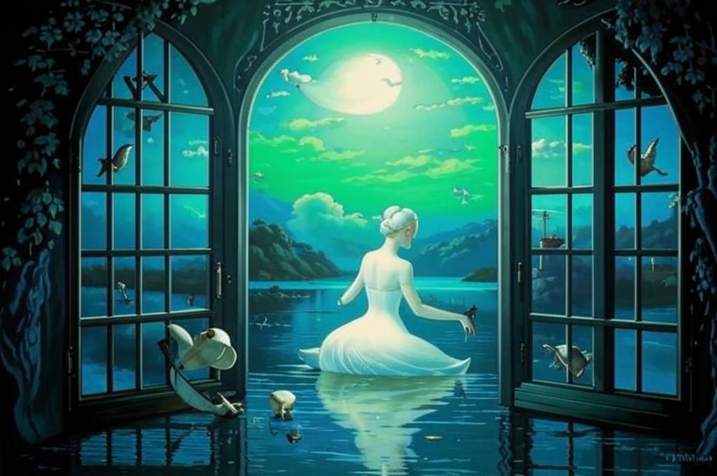 - В первом стихе описывается любимая женщина, которая появляется у окна, доверяясь снам, что уже создает волшебную атмосферу.