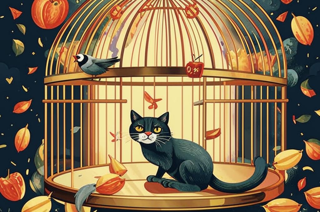 Сюжет строится на конфликте между Кошкой и Щеглом. Кошка наблюдает за Щеглом с желанием его "скушать", что символизирует угрозу для менее сильного. Падение клетки становится неожиданным поворотом, который оборачивается концом для Щегла.