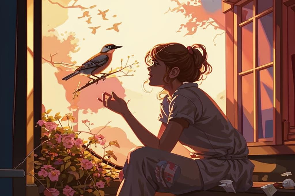 Символ птички в стихотворении является двусмысленным. С одной стороны, она олицетворяет красоту и свободу, с другой — может служить напоминанием о том, что героиня находится в плену собственных мыслей и иллюзий.