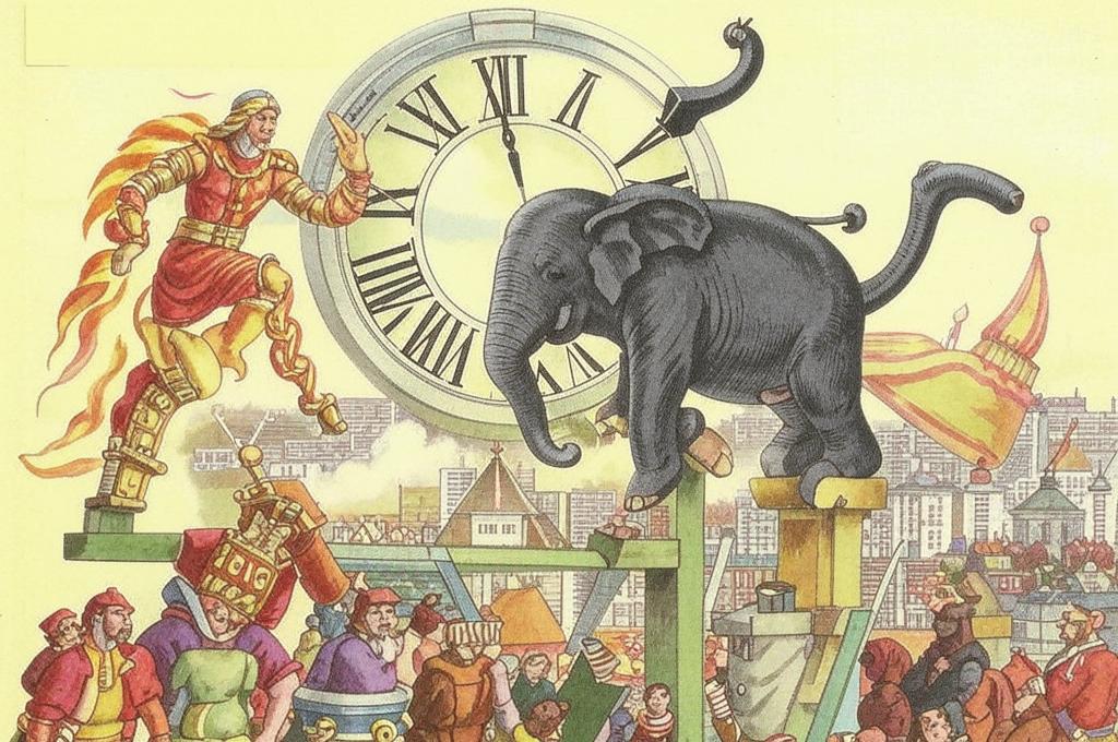 Слоны ассоциируются с тяжестью и величием, а «игрушечное стадо» может символизировать фальшь и иллюзию. Это контраст подчеркивает абсурдность ситуации.
