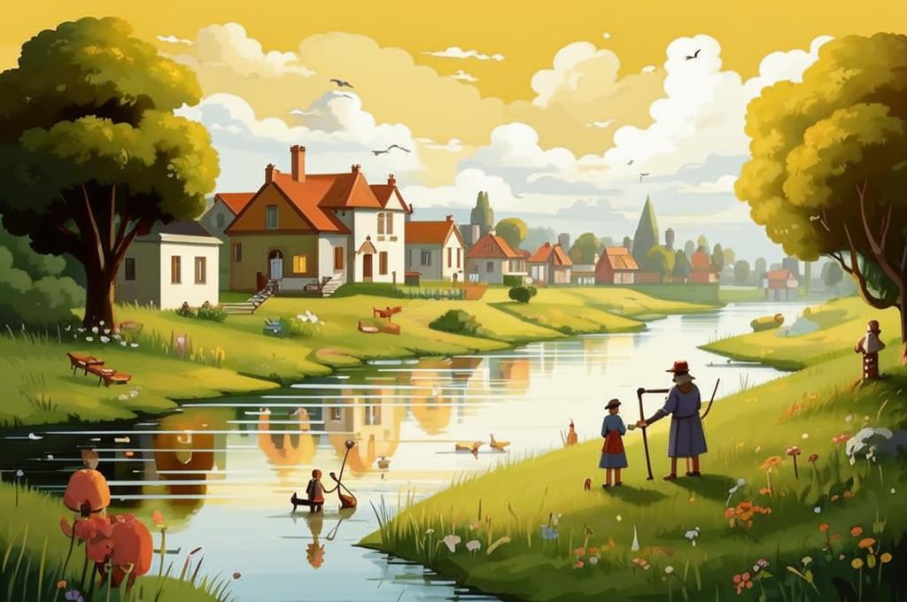 - Сюжет возникает в летний день у речки, где встречаются два героя — Кларнет и Рожок.