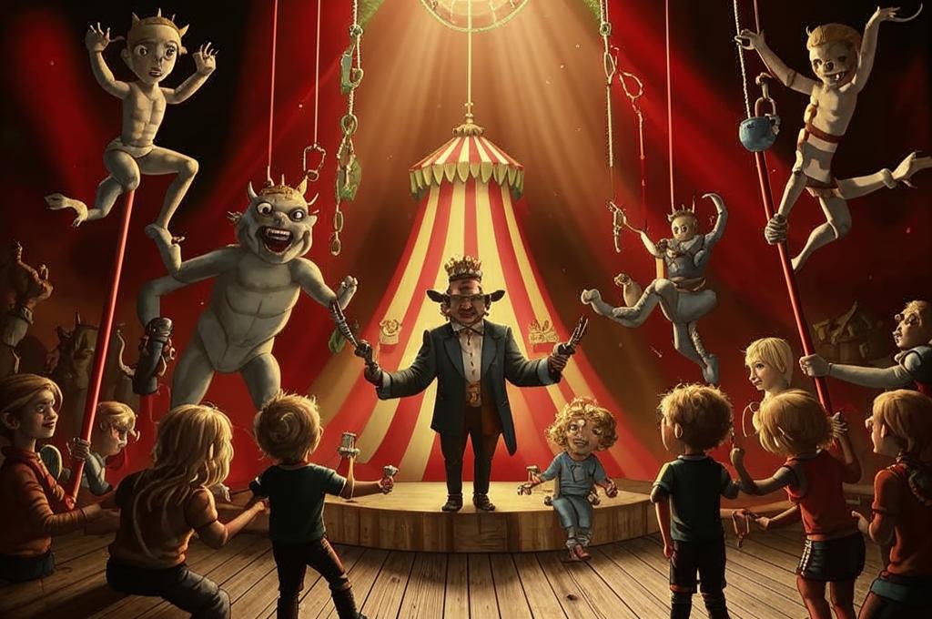 - Особая атмосфера балагана создает контраст между невинностью детей и мрачными темами.