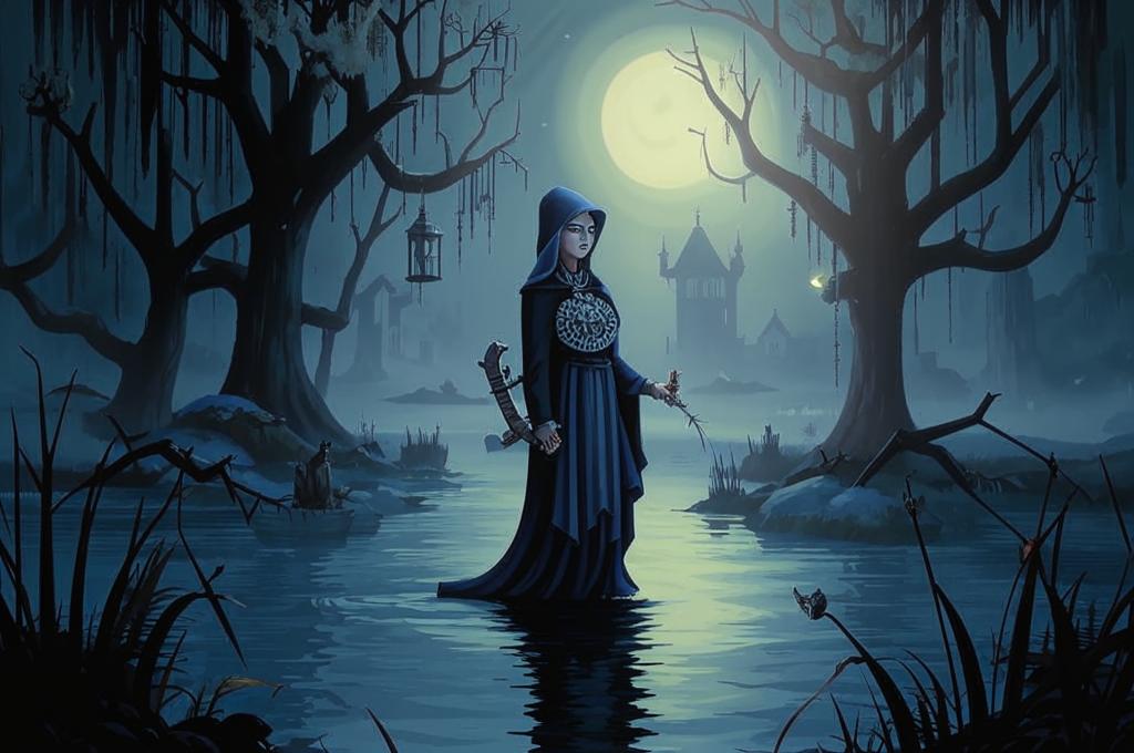Месяц, описанный как "зловещий фонарь", символизирует не только время, но и космические силы, влияющие на человеческую судьбу. Этот образ создает атмосферу безысходности, усиливая тему страха и покорности перед неизменными законами природы.