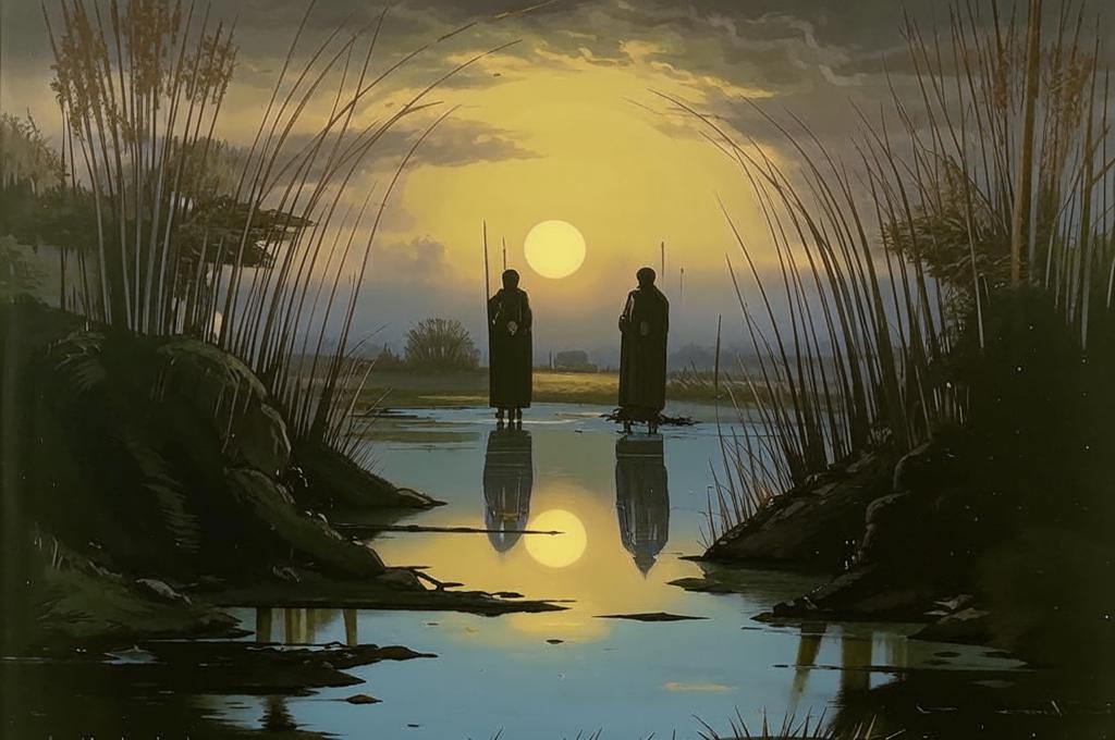 Образ месяца, уходящего в камыши, символизирует утрату чего-то важного, возможно, любви или надежды. Камыши становятся символом печали и прощания.