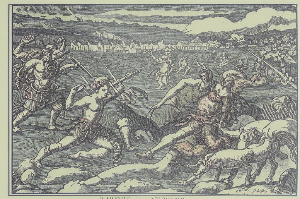 Воины в битве; звучала ужасно вкруг тел их могучих