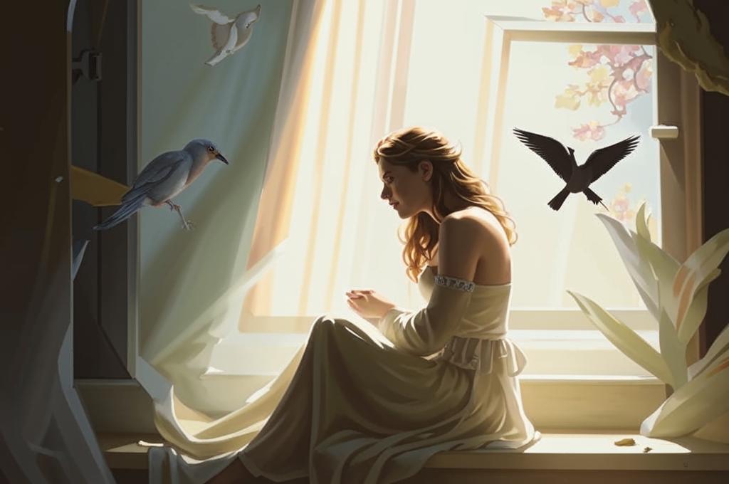 - Сравнение её состояния с плененной птичкой символизирует ощущение несвободы и тоску по недоступному счастью.