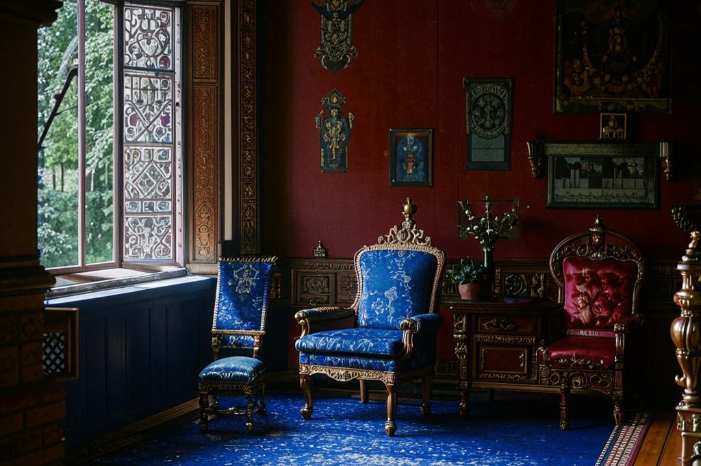 Царевна Софья сидит у стола в высоком резном кресле синего бархата. У ног, на полу ― мамка. По стенам скамейки, обитые персидской камкой.