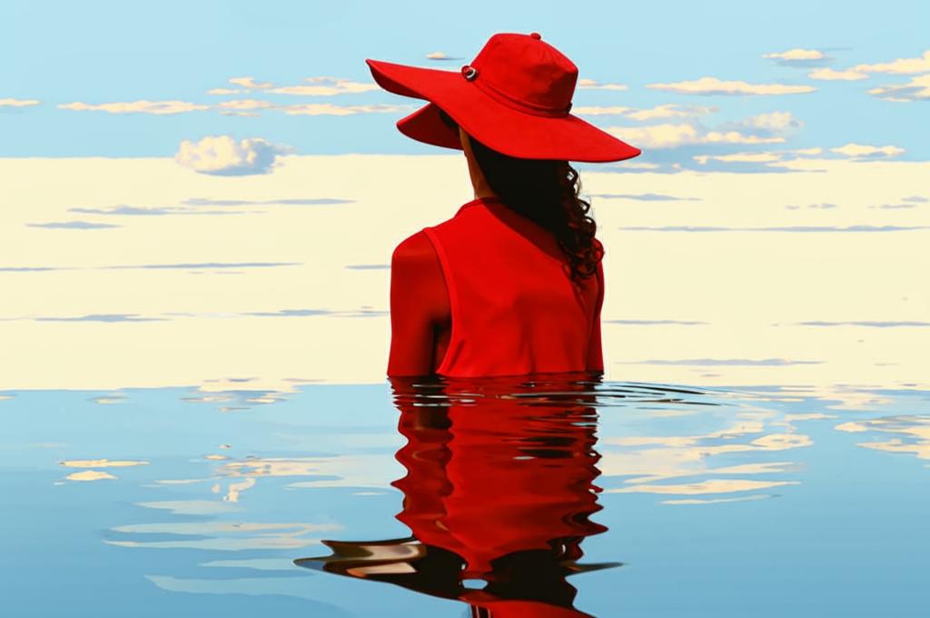 Два слоя синевы (небо и вода) создают эффект парения и слияния, что подчеркивает идею единения женщины с природой.