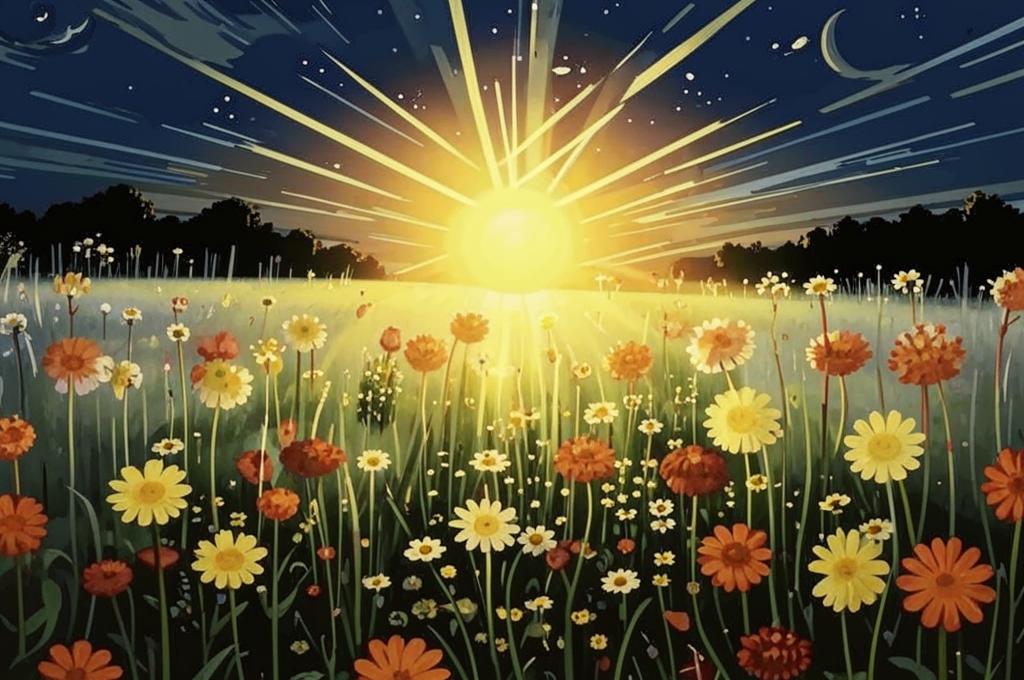 Цветы олицетворяют счастье, свободу и радость жизни. Веселое настроение полевых цветов противостоит печали бледного цветка.
