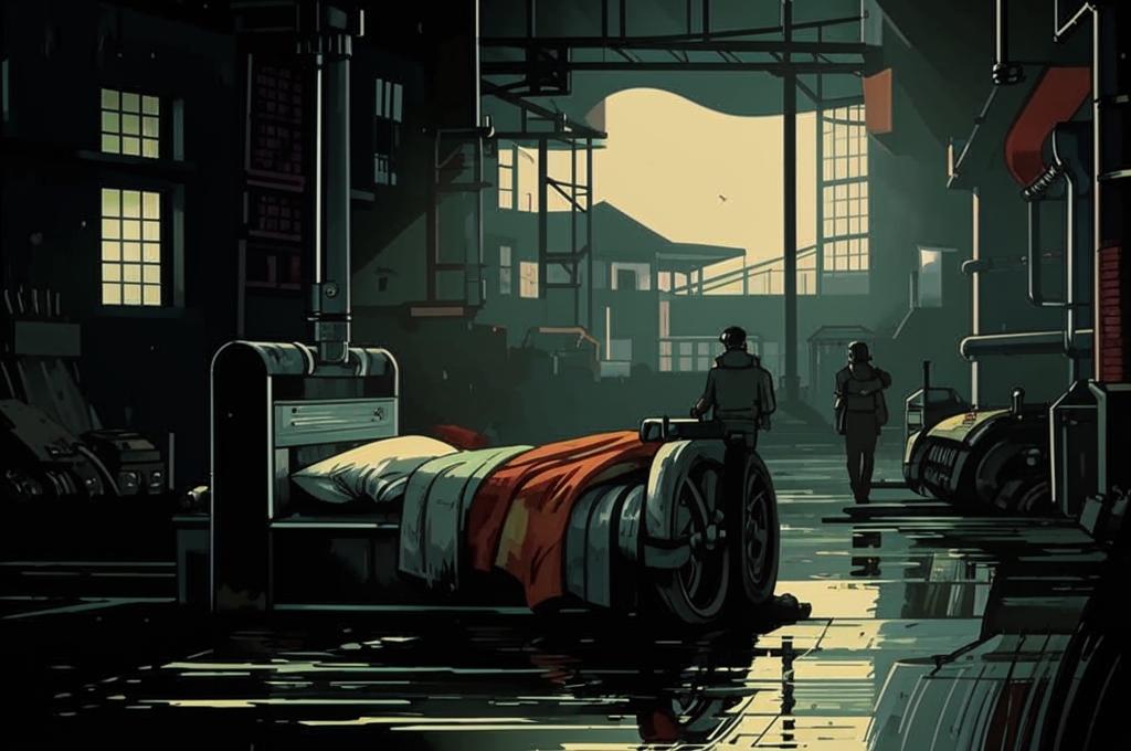 - Шумящий колесо фабрики контрастирует с внутренним миром человека, где царит тишина и темнота.