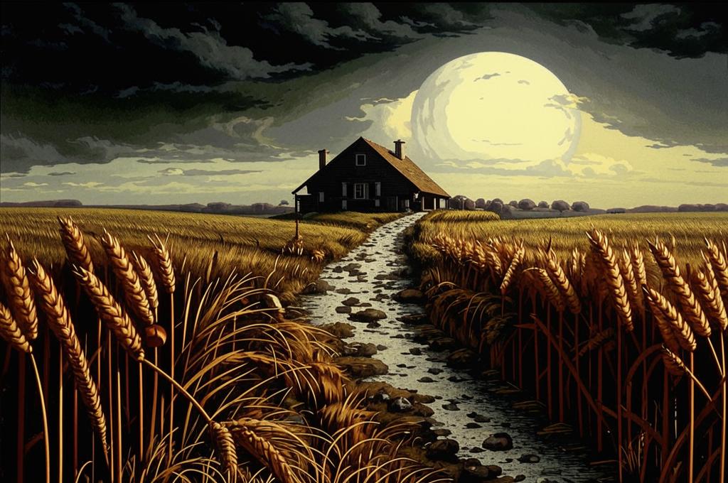 Образы колосьев и серп показывают связь человека с природой, его зависимость от неё и её жестокость.