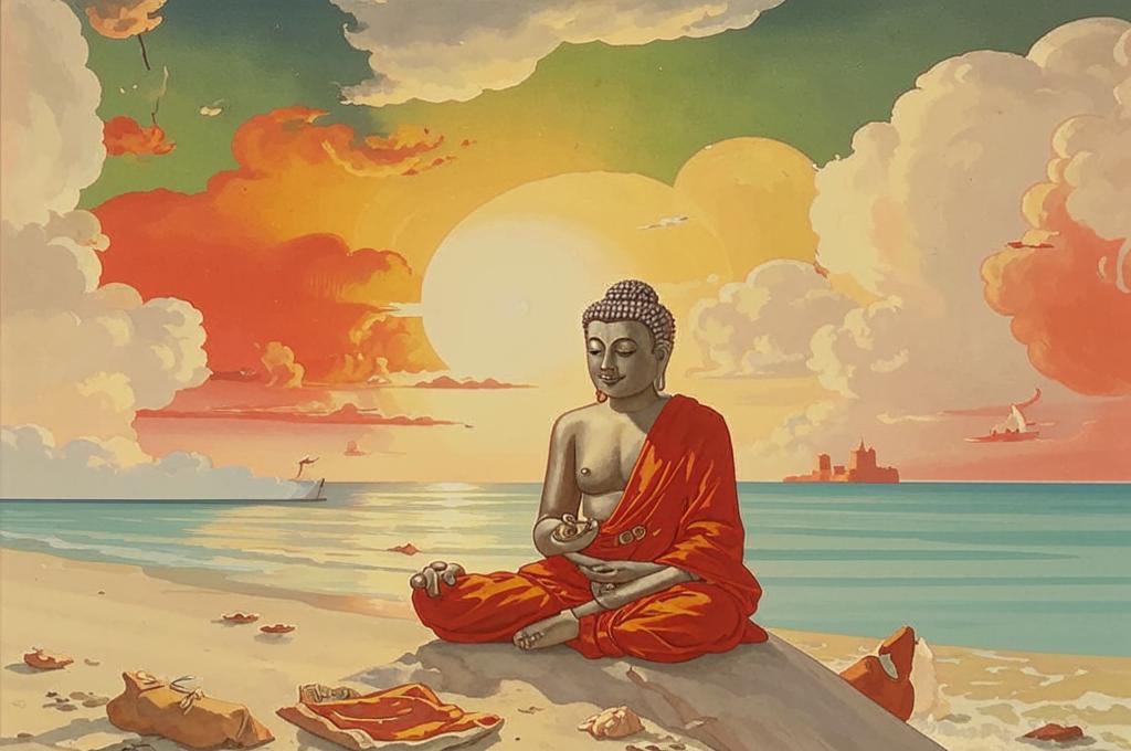 Песчаный пляж как место для беседы с Буддой подчеркивает интимность момента и усиливает эффект спокойствия.