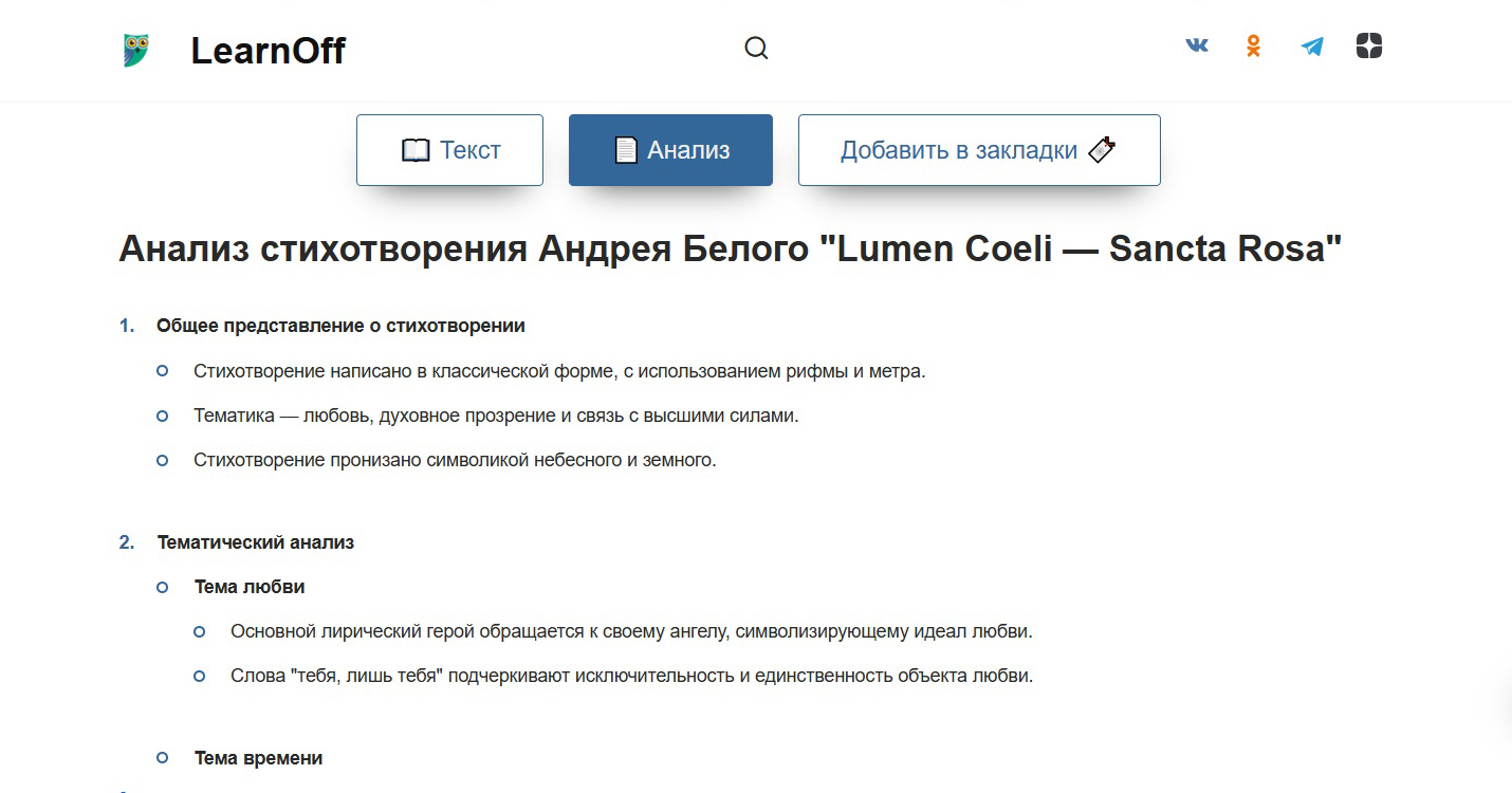 А главное — к каждому стихотворению на LearnOff.com прилагается подробный анализ: от размера и рифмы до стилистики и системы образов. Не нашли? Наша Сова подскажет, где искать.